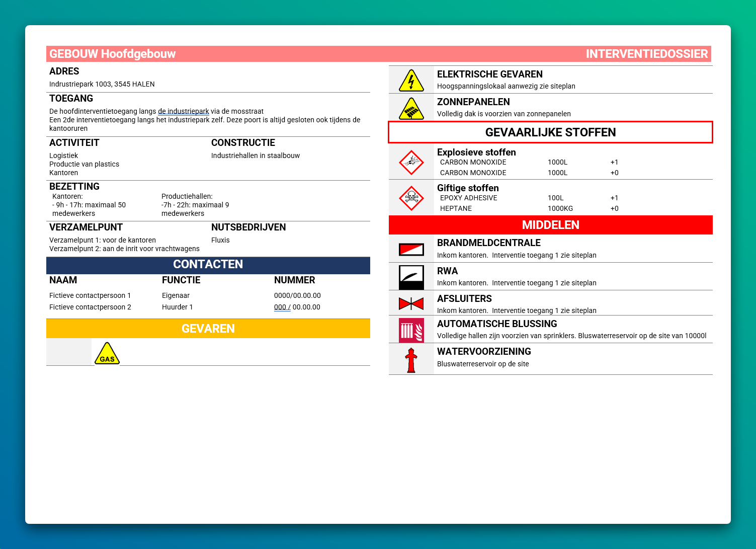 - Gevaarlijke stoffen: GHS-symbolen zijn toegevoegd, samen met de naam, hoeveelheid en locatie in de sectie 'Gevaarlijke Stoffen'. Wanneer je gevaarlijke stoffen aanduidt in het project met de GHS-iconen, worden deze automatisch opgenomen op het voorblad van het interventiedossier.
