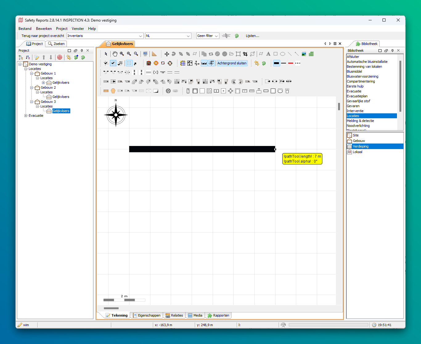 Tijdens het tekenen wordt de lengte van het laatste segment steeds getoond. Kom je in de buurt van een rasterpunt, dan zal de muur naar dit punt springen. Wil je dat niet dan moet je meer inzoomen met je scrollwheel van je muis of de raster snap desactiveren.