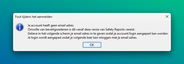 Klik op OK om automatisch in te loggen met uw e-mailadres in Safety Reports.
