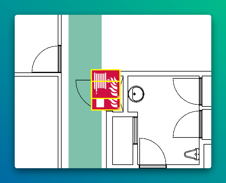 Wanneer je een evacuatieplan op de verdieping plaats zal je merken dat het icoon een richting aangeeft. Deze richting is belangrijk voor de orientatie van het evacuatieplan. Je kan het icoon draaien door het te selecteren en te draaien met het gele ronde handvatje. Om het icoon mooi recht te plaatsen hou je SHIFT ingedrukt terwijl je het icoon draait.