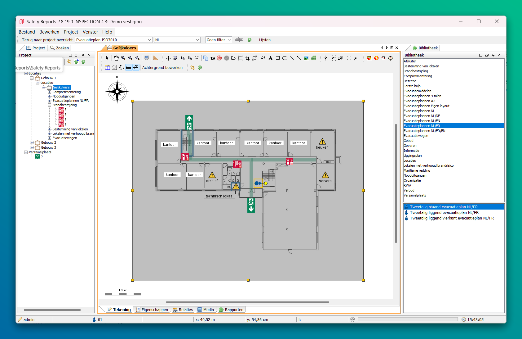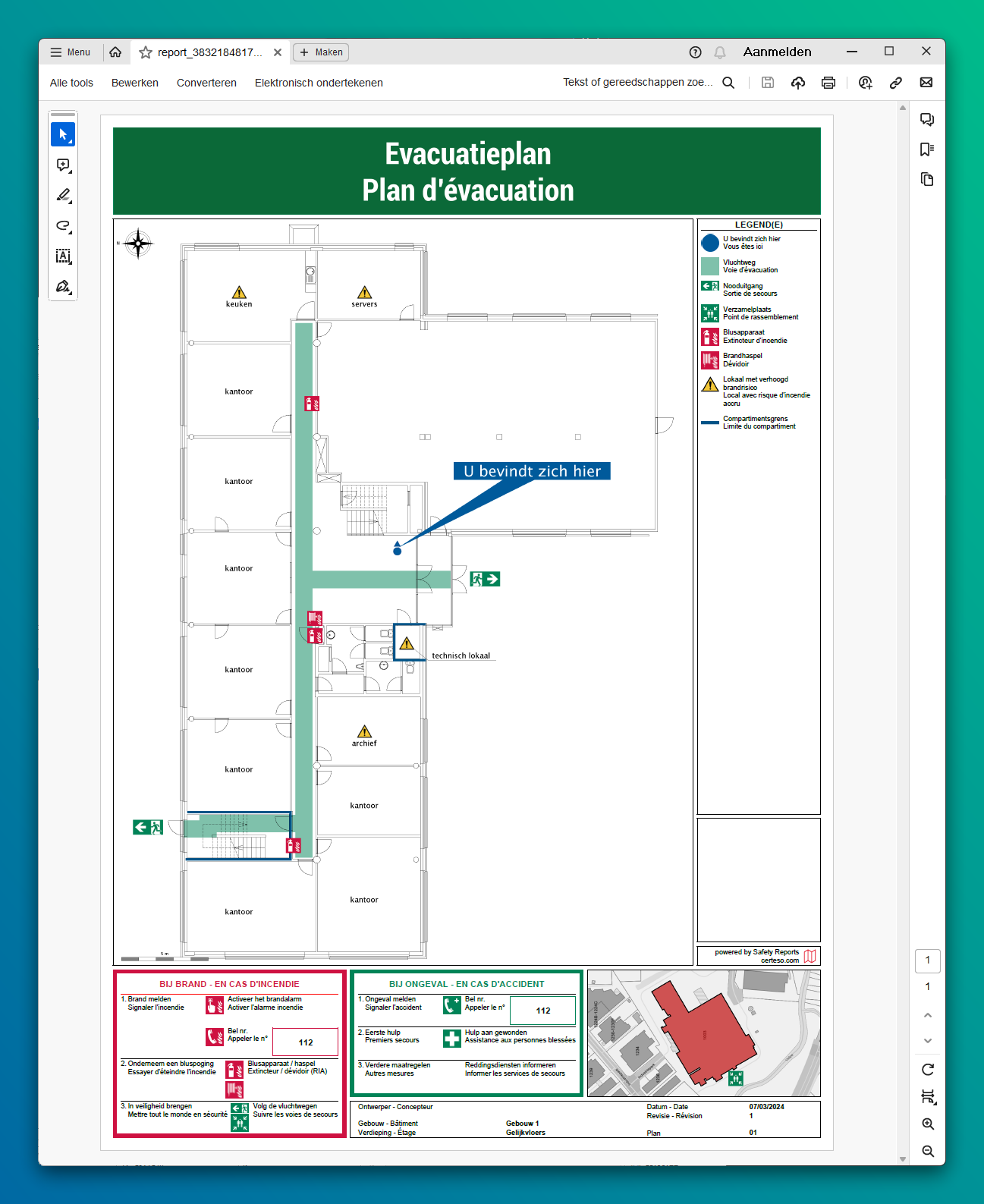 Met Safety Reports kan u evacuatieplannen maken die voldoen aan de Belgische wetgeving (Codex welzijn op het werk) en die gebaseerd zijn op de ISO 23601 standaard.