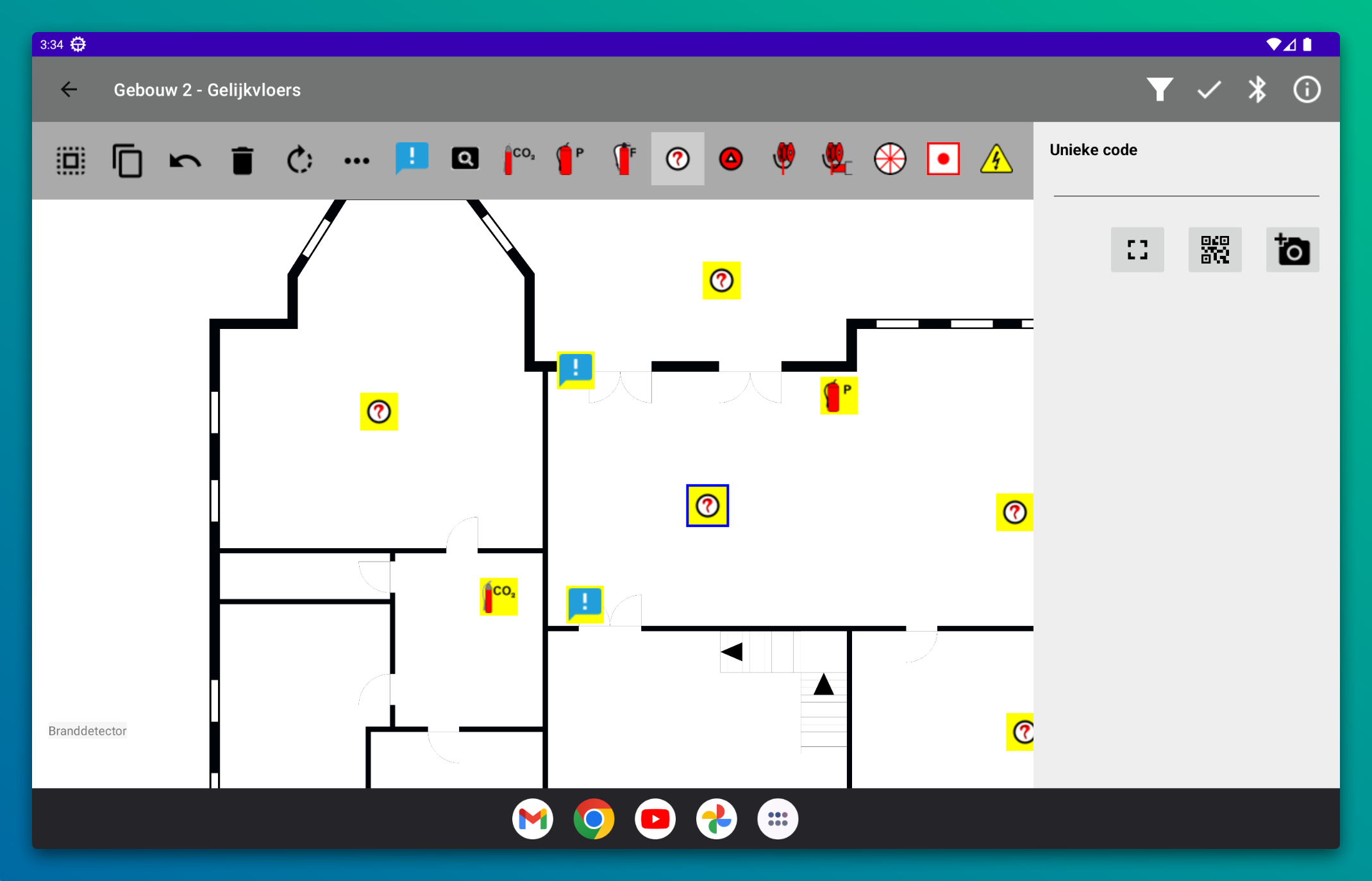 Nieuwe iconen voegen we toe door op het icoon te drukken in de toolbar en dan op de tekening te drukken. Om het icoon te verplaatsen hoef je je vinger niet op het icoon te plaatsen. Zo lang een icoon geselecteerd is beweeg je het door met één vinger over de tekening de bewegen.